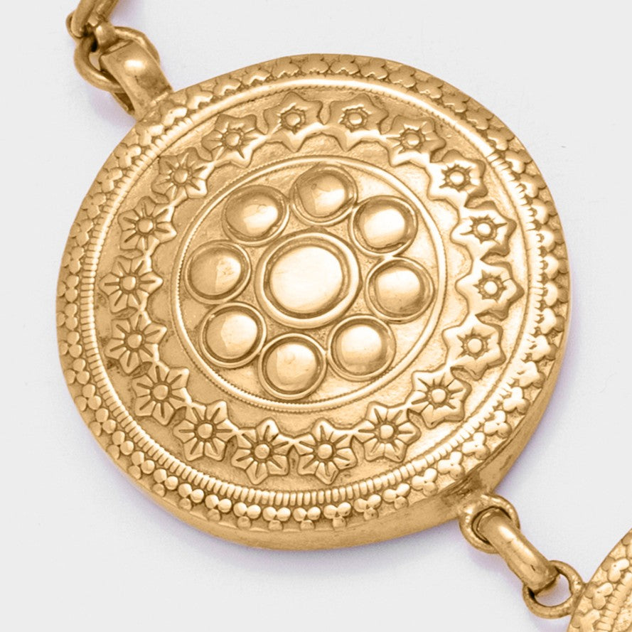 من الذهب الأصفر عيار 21، مزينة بنقوش عربية إسلامية مستوحاة من الطاسة التقليدية، بتصميم أنيق يعكس روح الأصالة بلمسة عصرية.