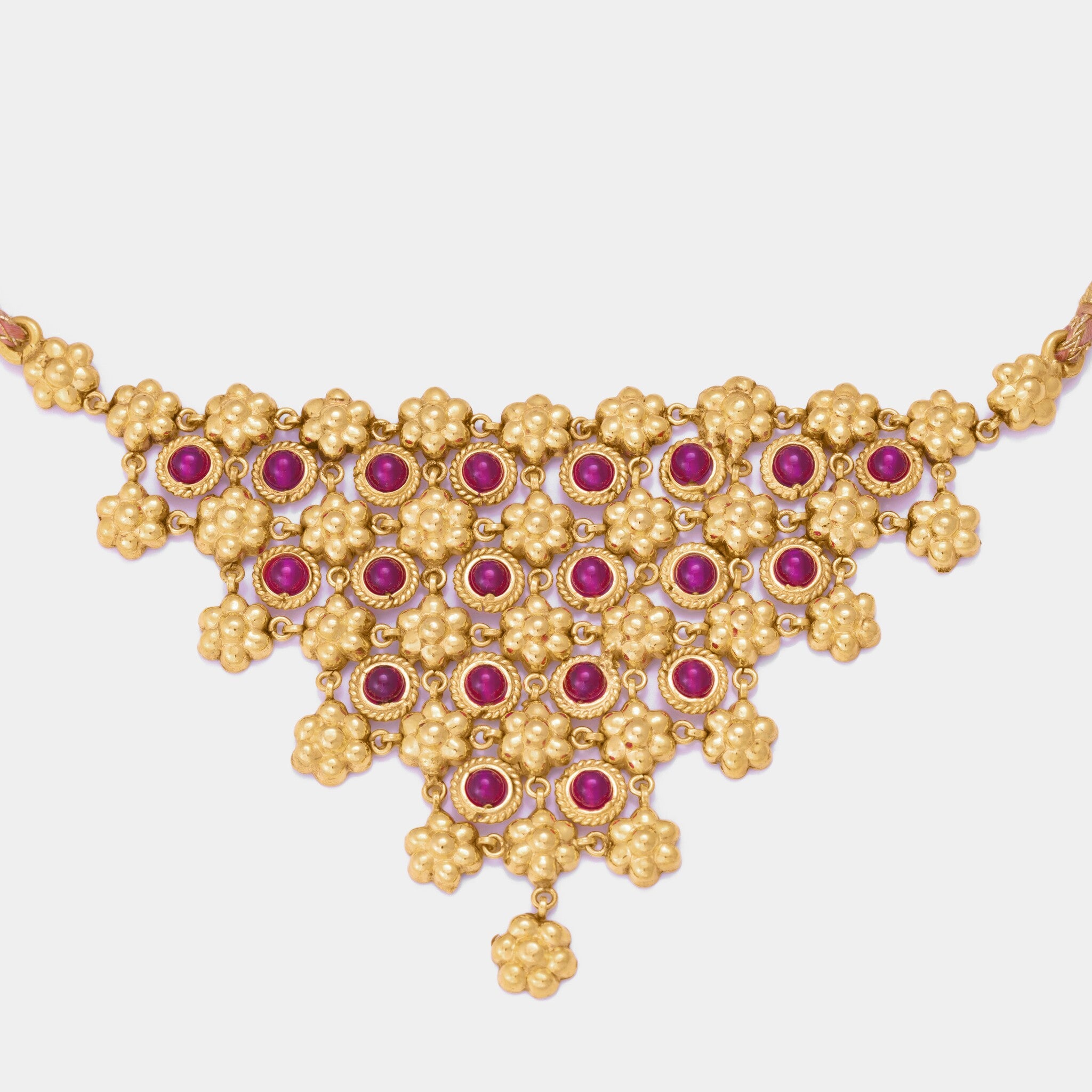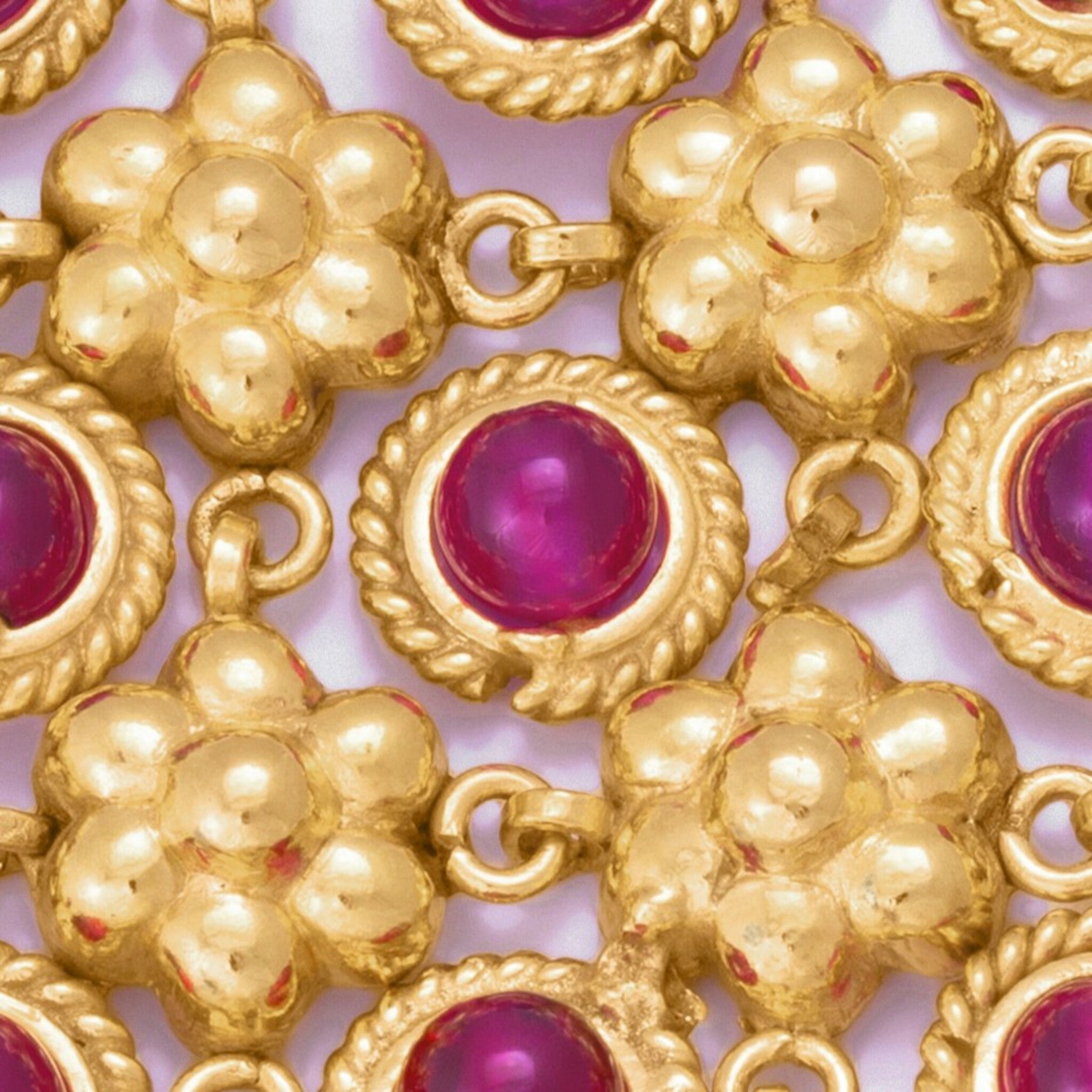 من ذهب عيار 21، مُزيَّن بحجر الكوارتز الوردي ومزنّط بحرير هندي فاخر، يتكوّن من حلق وخاتم وأسوارة. يتميز بإطار محيط بالأحجار مستوحى من تصميم الخناجر الخليجية والسيوف العربية، ليعكس أصالة التراث وقوة رموزه. صيغ بحرفية عالية ليجسّد تمازج الفخامة مع اللمسة التراثية في قطع متكاملة تمنح إطلالتك تفرّدًا وأناقة متألقة.