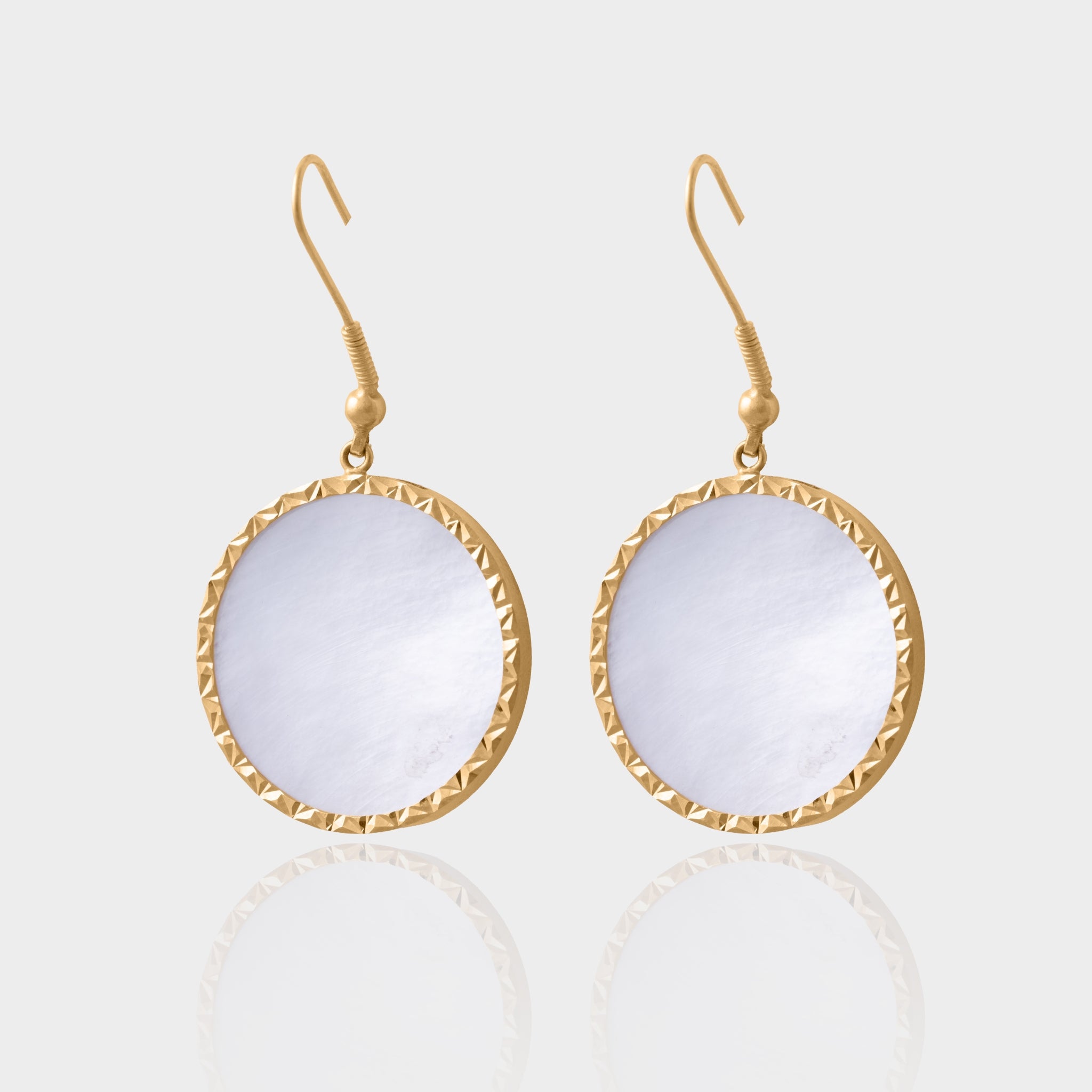 حلق "عذبة" من الذهب الأصفر عيار 21، مزين بقطع صدف صديفي بحريني طبيعي صُمم بدقة من محارات متطابقة، ليجمع بين فخامة الذهب ورونق البحر.