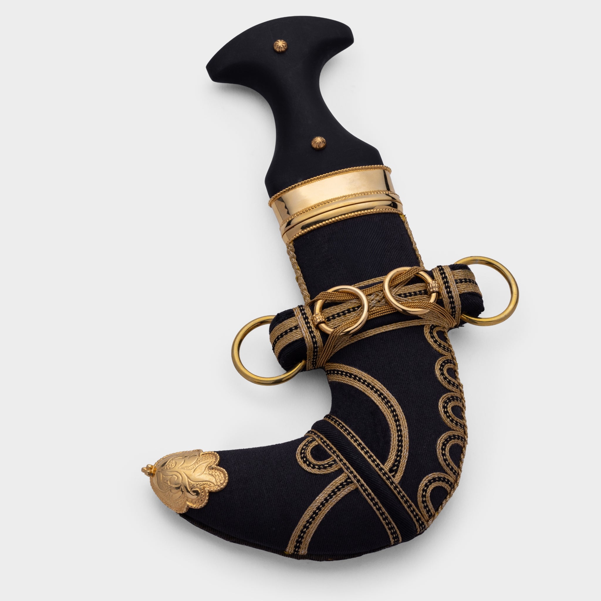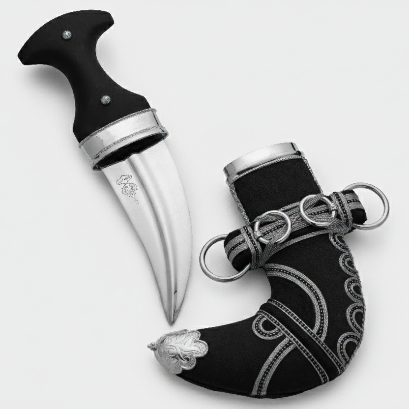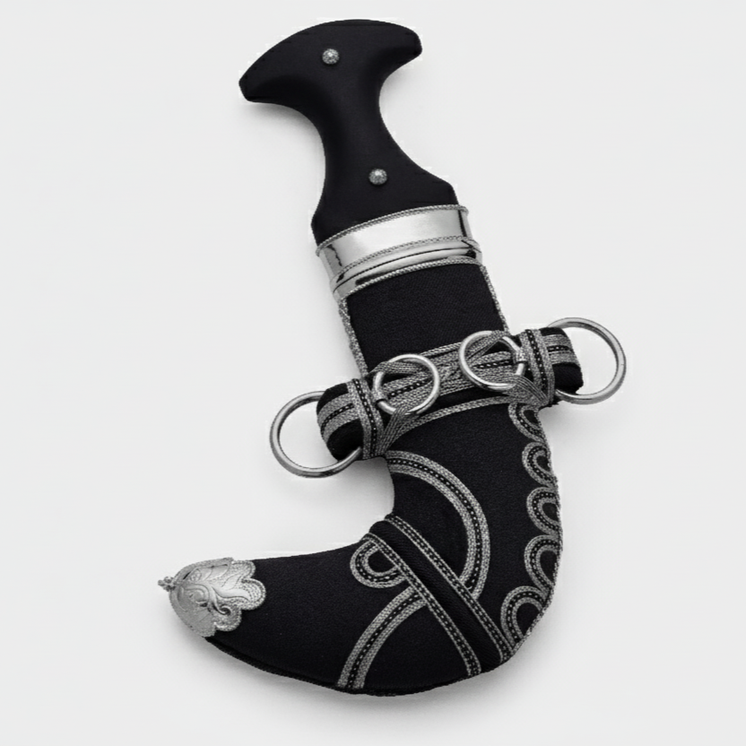 خنجر فاخر مصنوع يدويًا في البحرين، باستخدام أقمشة عالية الجودة ومعادن ثمينة ونصل من الفولاذ البرازيلي. يتميز بتطريزات ذهبية أنيقة ، في مزيج يجمع بين الأصالة والفخامة.