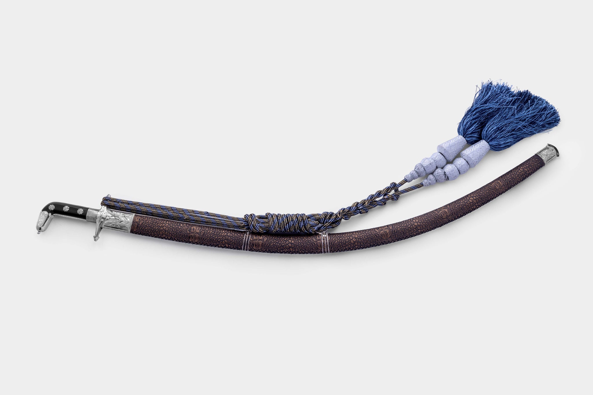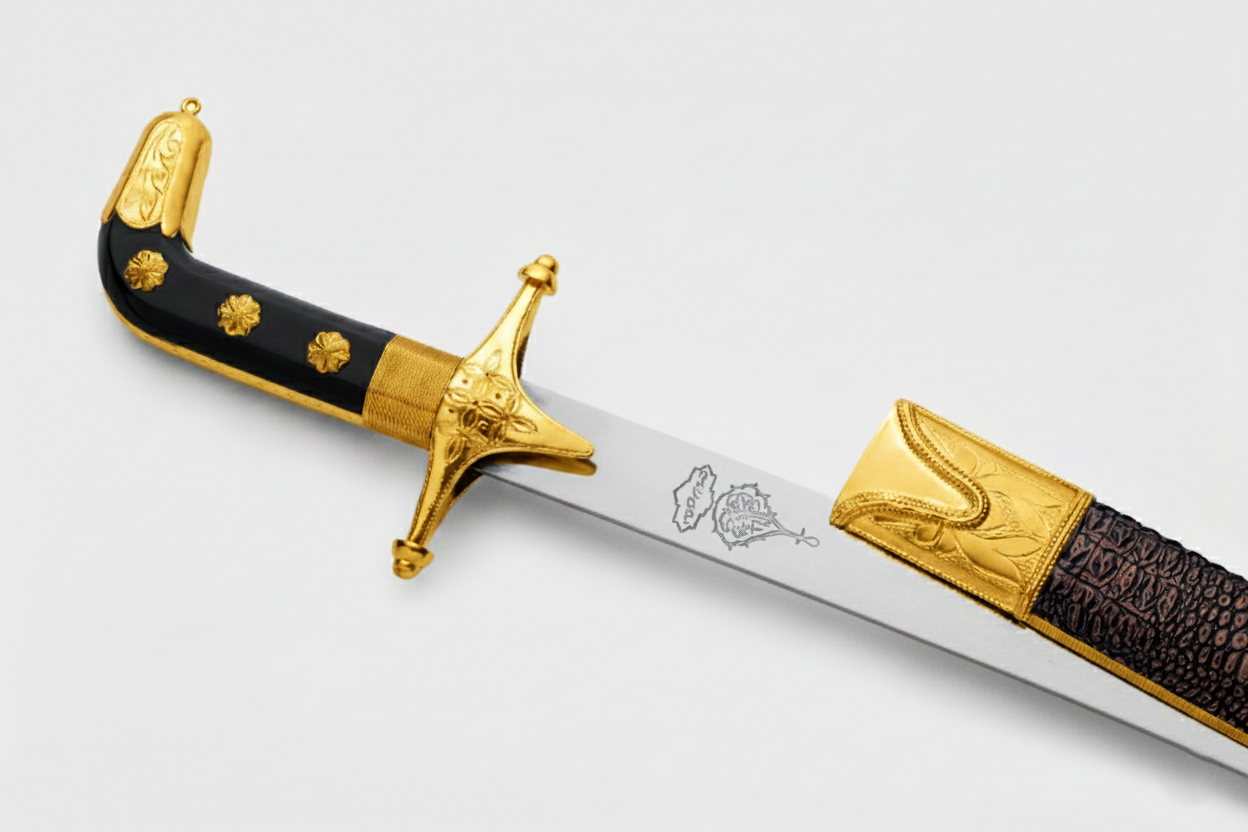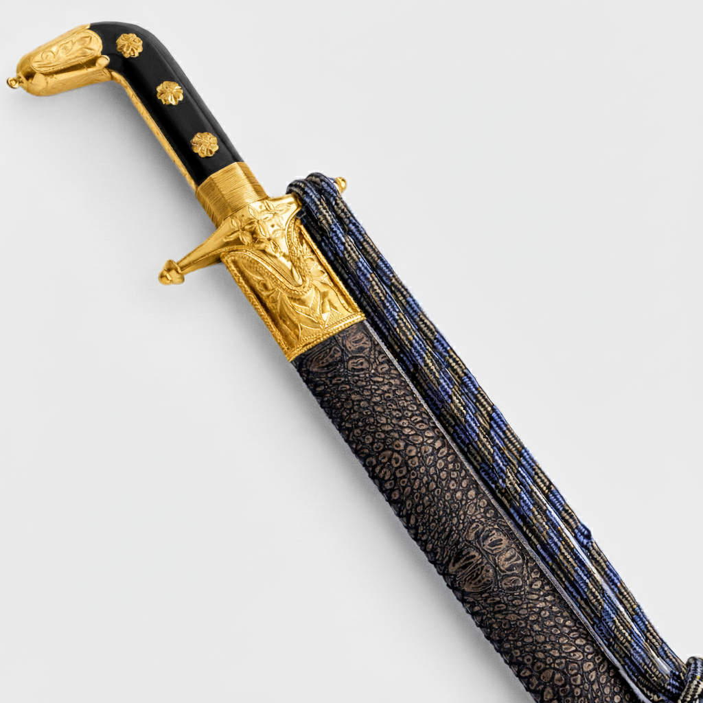 تحفة بحرينية أصيلة، مصوغة يدويًا بإتقان يجمع بين الجلد الطبيعي والفولاذ البرازيلي الممزوج بلمسات من الذهب أو الفضة. قطعة استثنائية تجسّد الفخامة والهوية العربية العريقة.