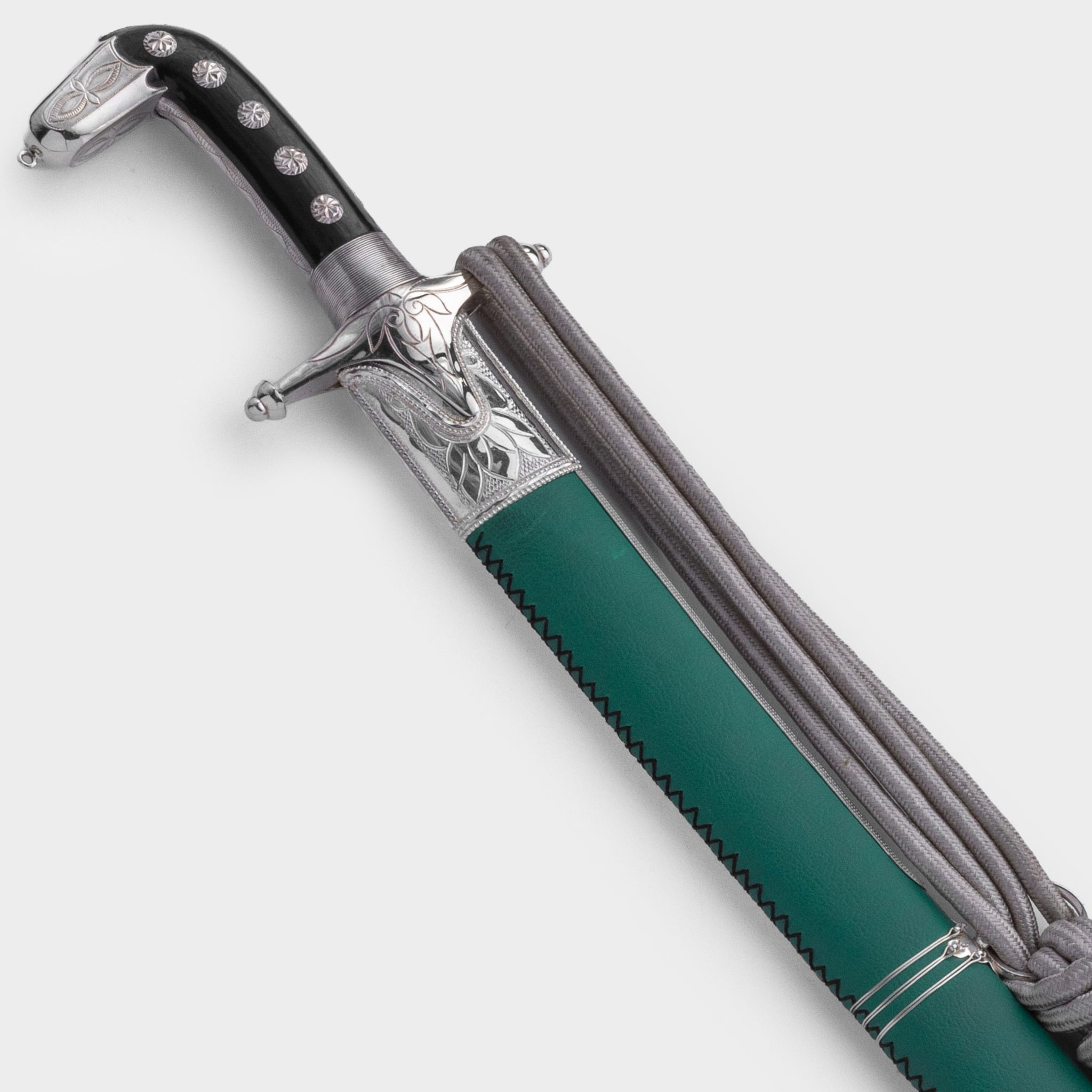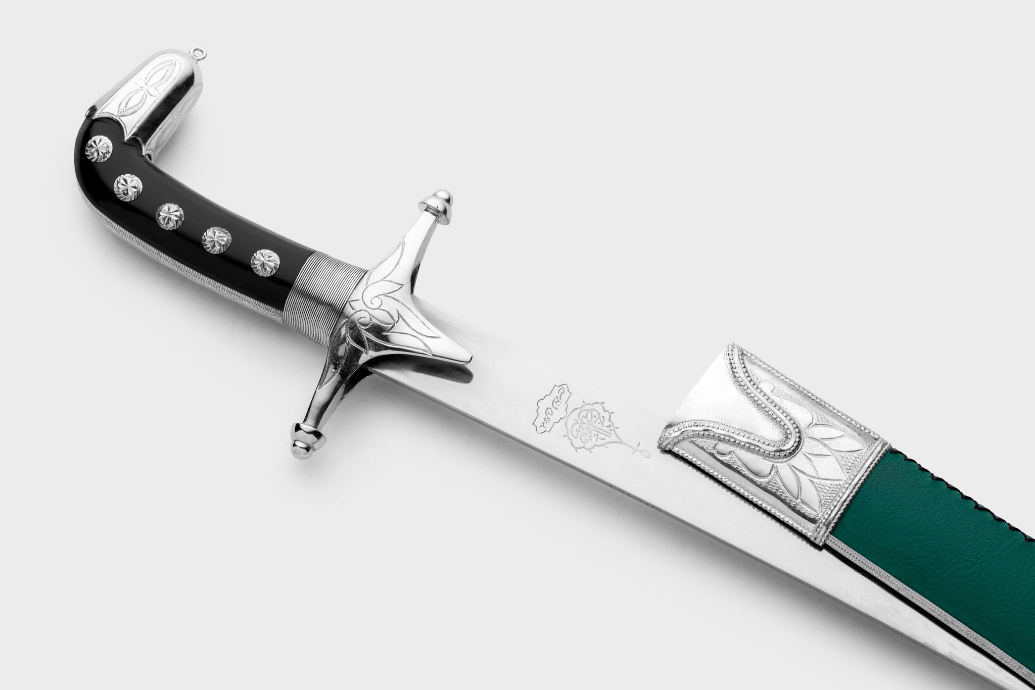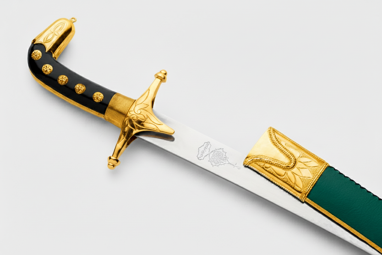 تحفة بحرينية أصيلة، مصوغة يدويًا بإتقان يجمع بين الجلد الطبيعي والفولاذ البرازيلي الممزوج بلمسات من الذهب أو الفضة. قطعة استثنائية تجسّد الفخامة والهوية العربية العريقة.