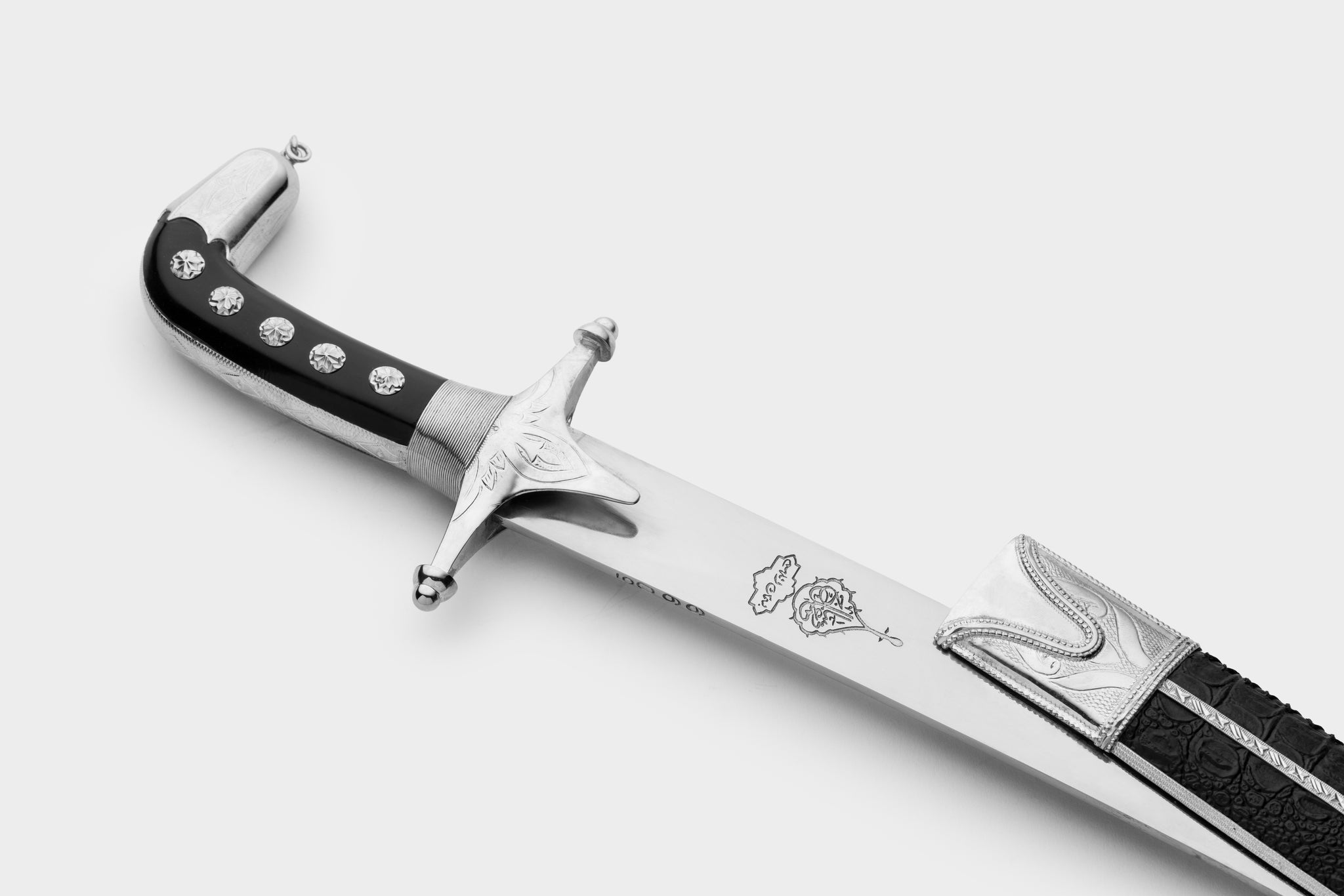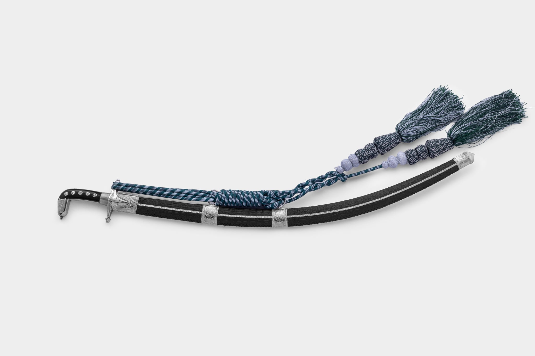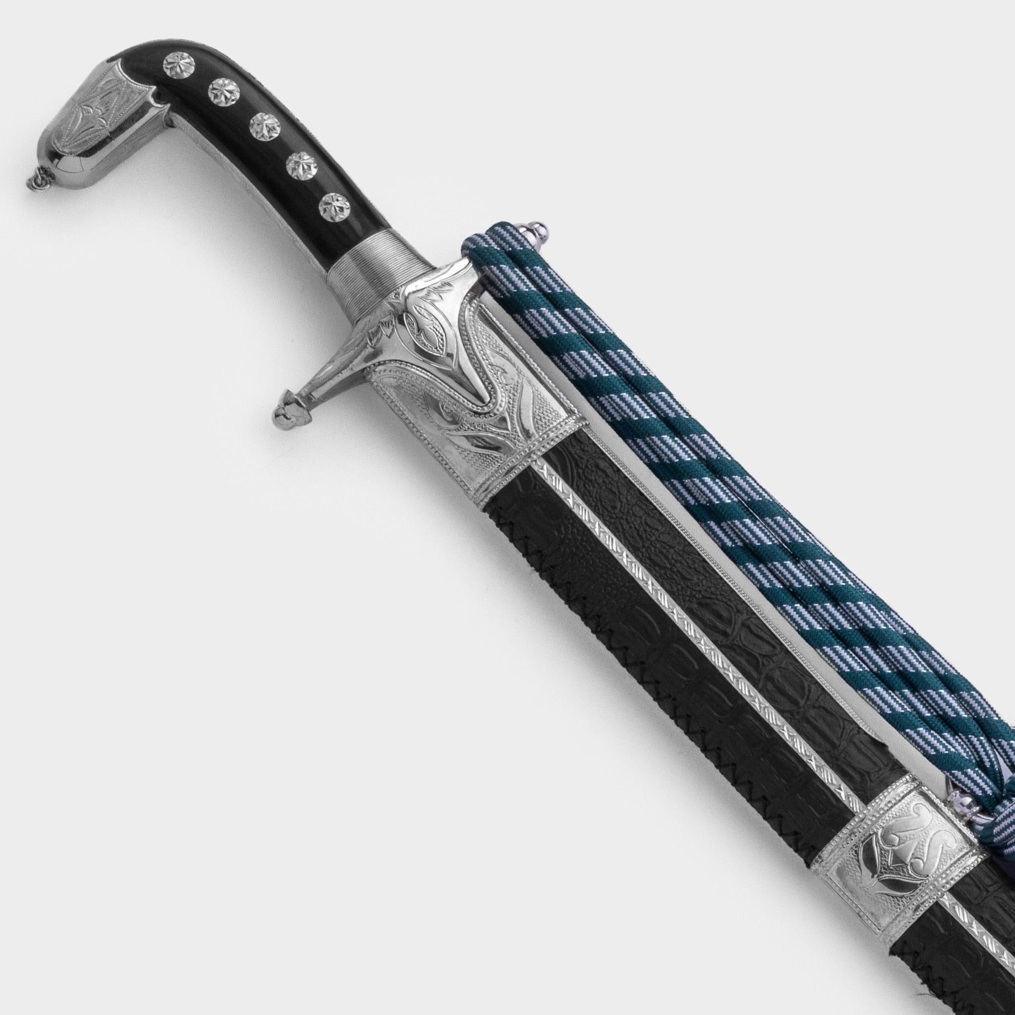 تحفة بحرينية أصيلة، مصوغة يدويًا بإتقان يجمع بين الجلد الطبيعي والفولاذ البرازيلي الممزوج بلمسات من الذهب أو الفضة. قطعة استثنائية تجسّد الفخامة والهوية العربية العريقة.