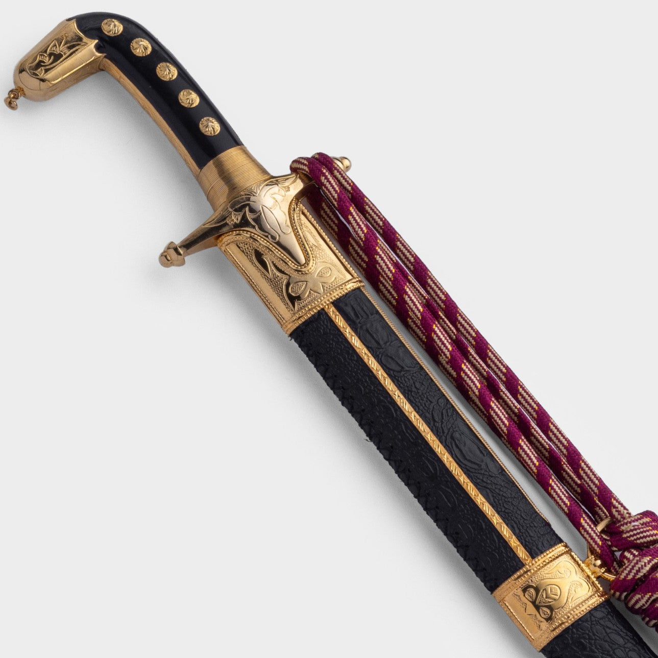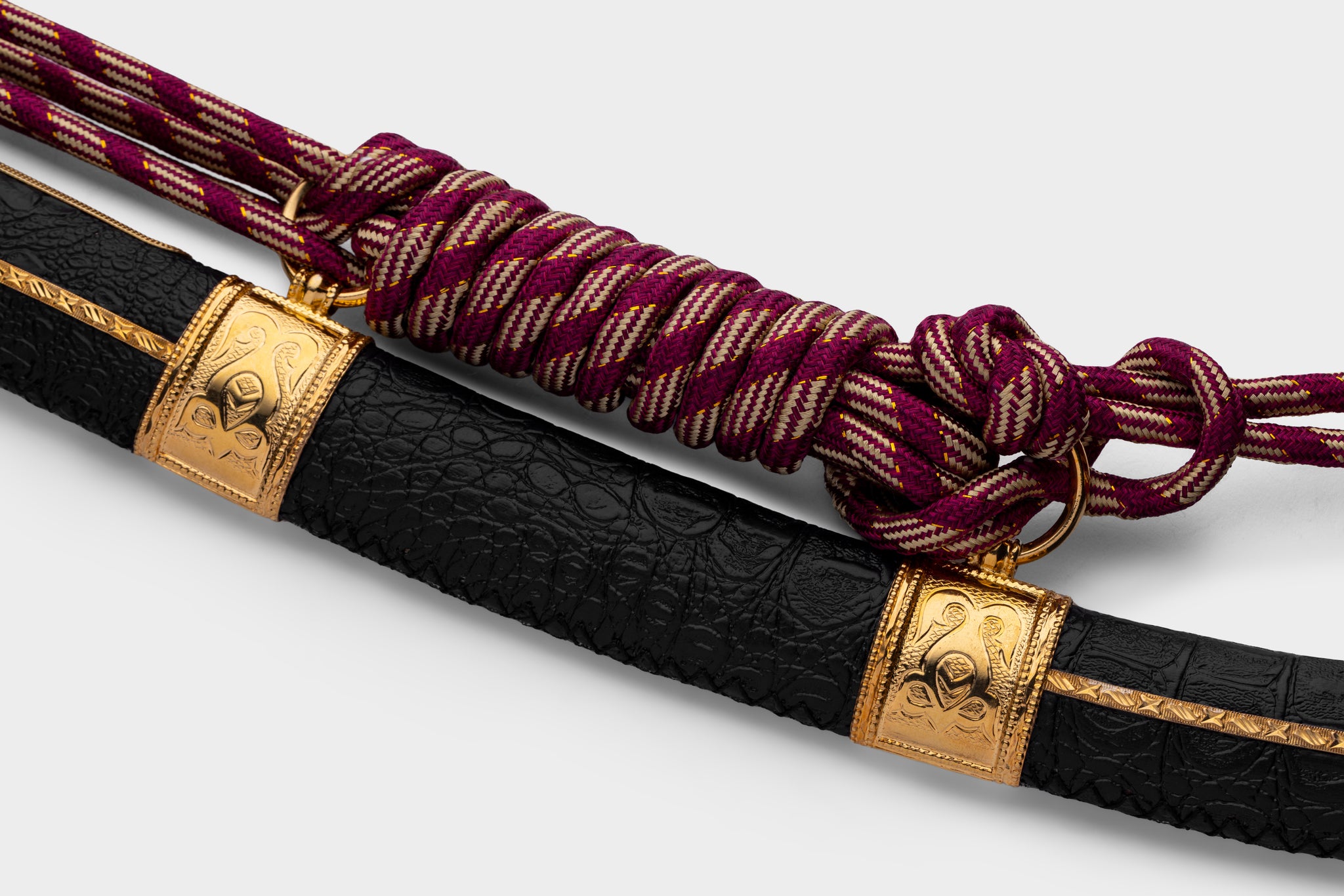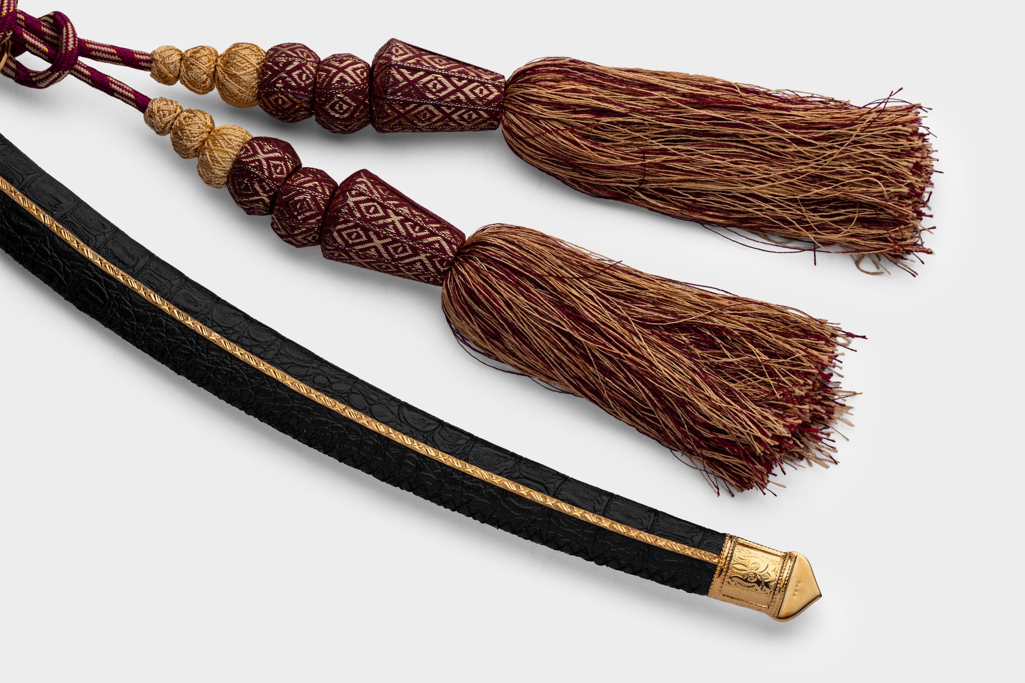 تحفة بحرينية أصيلة، مصوغة يدويًا بإتقان يجمع بين الجلد الطبيعي والفولاذ البرازيلي الممزوج بلمسات من الذهب أو الفضة. قطعة استثنائية تجسّد الفخامة والهوية العربية العريقة.